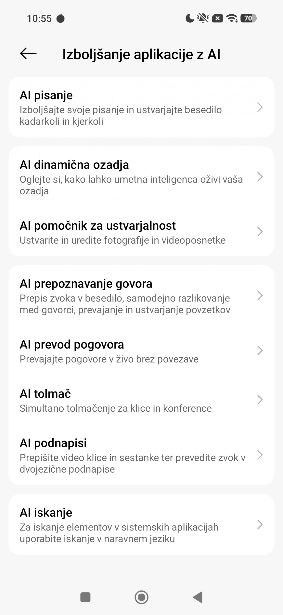 Pisanje, ozadja, ustvarjanje, urejanje fotografij, prevajanje, tolmačenje, ustvarjanje podnapisov v živo, iskanje … Pri vsem tem je vpletena umetna inteligenca in to so samo funkcije, ki so del Xiaomijevega portfelja HyperAI. Na voljo je tudi Gemini kot samostojna aplikacija ali pa kot pomočnik, ki ga prikličeš z ukazom ali z daljšim klikom na gumb za vklop (tako kot pri vseh rivalih). Vsi proizvajalci se močno trudijo, da bi uporabnik na vsakem koraku posegel po eni od UI funkcij. Včasih uspešno, večinoma neuspešno, odvisno od uporabnika. Če veliko potuješ, je prevajanje in tolmačenje super, pod pogojem, da se pogovarjaš v enem od podprtih jezikov. Ustvarjanje podnapisov je zame popolnoma neuporabno in celo nadležno. Pri pisanju prav tako za zdaj ne potrebujem pomoči. Bolj mi je všeč funkcija transkripcije, ki jo potrebujem pri povzemanju intervjujev. Pri fotografijah se spet pogosto ne poslužujem umetne inteligence, ker res redko hočem kakšno fotografijo popraviti ali pa v celoti spremeniti. Vaša izkušnja je lahko zelo drugačna.