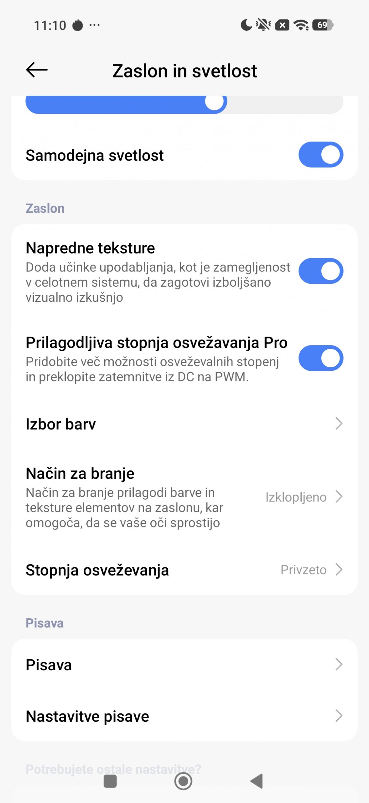 Osveževanje je zdaj že standardno med 1 in 120 Hz, kar seveda uravnava sam. Pri tehnologiji zatemnjevanja se lahko odločiš med DC in PWM zatemnitvijo, kar je posebnost, ki jo Xiaomijevi Ultra telefoni poznajo že od lanske serije. Večini to ne bo pomembno. Če imate po uporabi telefona pogosto utrujene oči, priporočam, da si v nastavitvah vklopite DC način zatemnitve, ki ne povzroča utripanja zaslona.