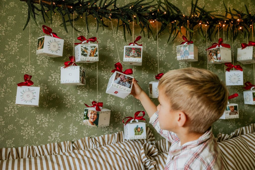 Adventni koledar s fotografijami za okenci in kolaž posterjem.
