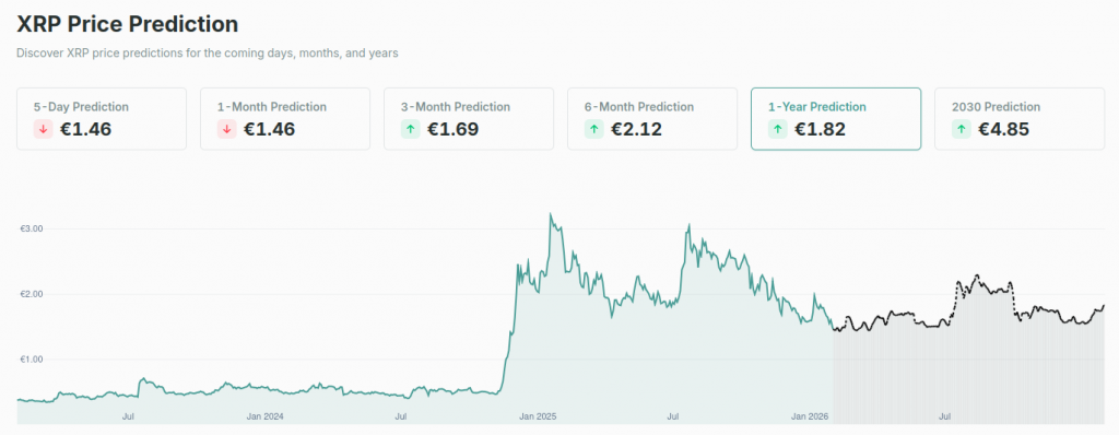 Napoved cene za XRP s portala CoinCheckup predvideva, da bo XRP v tem letu dosegel vrhunec pri €2.29, kar bi predstavljalo 54% rast glede na trenutno ceno.