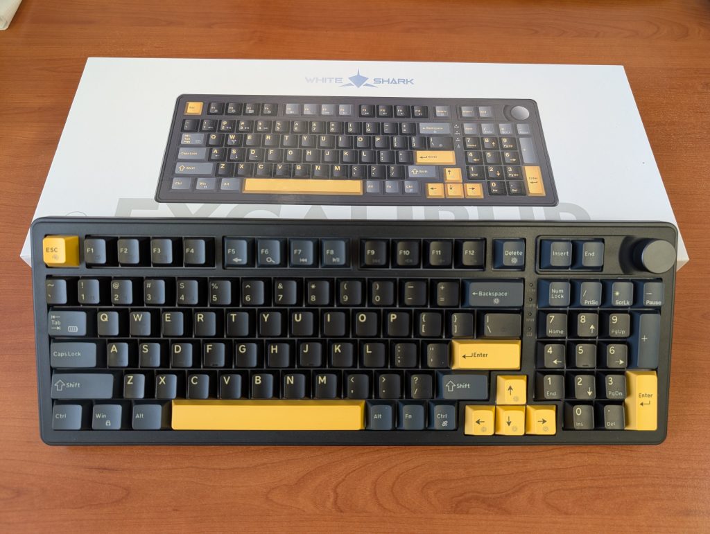 White Shark Excalibur je všečna tipkovnica in črno-(temno)sivo-rumena kombinacija ji pristaja. Z njo želi povedati, da ni povsem običajna tipkovnica. Ni najmanjša, kar sem jih v zadnjem času preizkusil, vseeno pa je dovolj kompaktna in obenem prostorna. In ne daje občutka utesnjenosti že na prvi pogled.