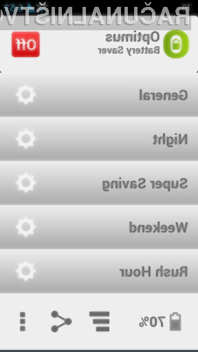 Programska oprema Optimus Battery Saver nam samodejno izključi nepotrebne funkcije mobilnika vsakič, ko se baterija izprazni do določenega nivoja. Ker lahko profile za upravljanje s pametnim mobilnim telefonom in tabličnim računalnikom povežemo s časom, bo izjemno uporabna aplikacija neprestano skrbela, da se bo avtonomija naše mobilne naprava kar se le da podaljšala.