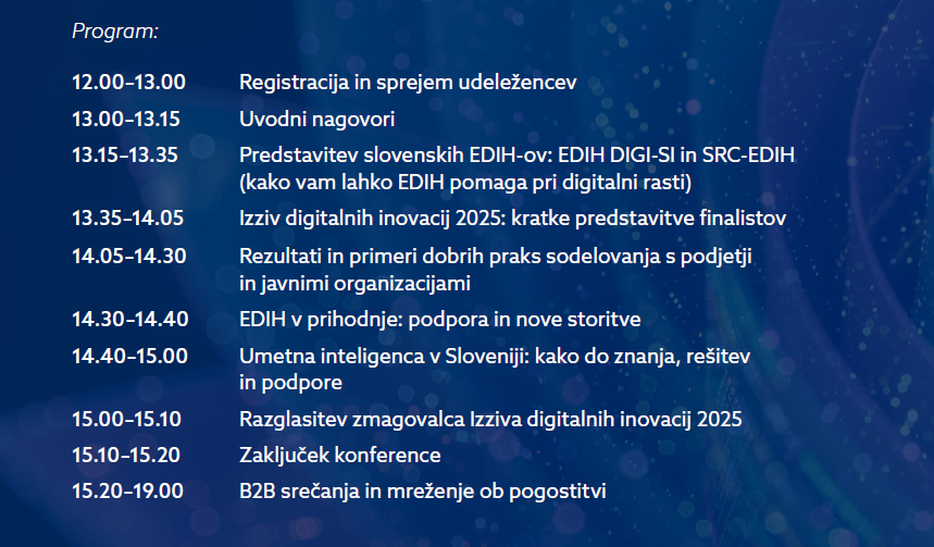 V uvodnem delu dogodka bodo organizatorji predstavili vlogo in delovanje slovenskih EDIH-ov ter pojasnili, na kakšen način lahko podjetja in institucije izkoristijo njihove storitve za pospeševanje digitalne rasti. Gre za podporo, ki zajema vse od svetovanja in testiranja tehnologij do izobraževanj in povezovanja z raziskovalnimi ter industrijskimi partnerji.