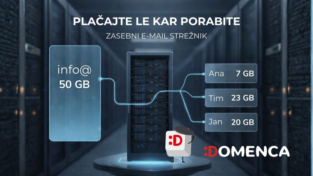 Domenca ponuja drugačen pristop. Namesto ločenih kvot zakupite skupni prostor (od 50 GB naprej), ki ga lahko razporedite med poljubno število e-mail predalov glede na dejanske potrebe. Plačujete le za prostor, ki ga dejansko uporabljate, vsi podatki pa so shranjeni v Sloveniji, neodvisno od tujih ponudnikov.