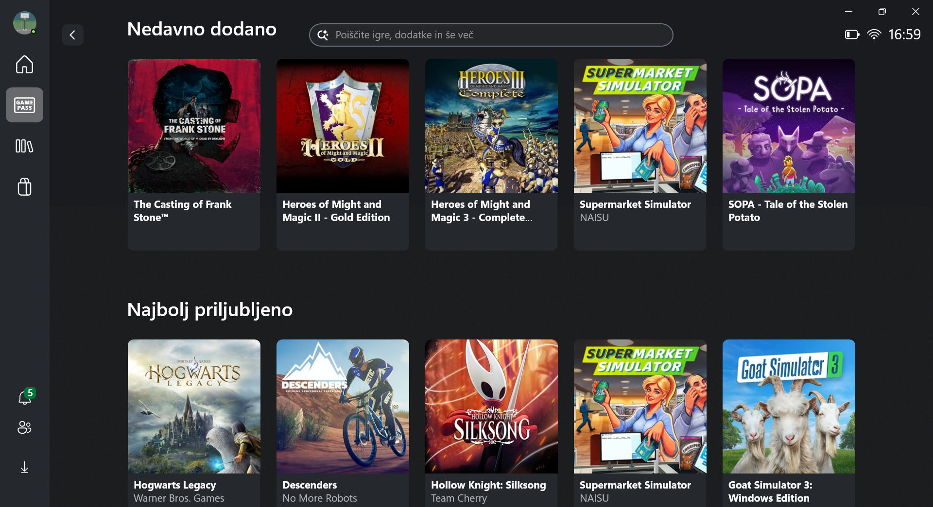 Nov Xbox vmesnik, ki je na voljo na novem ASUS ROG Xbox Ally X (na voljo bo tudi na prvotnem ROG Ally), in do katerega dostopamo z novim Xbox gumbom, meni bolj deluje kot čisto običajen celozaslonski način s poudarkom na enostavni dostopnosti do naloženih programov in iger. Ko klikneš dvakrat na ta gumb, Windows 11 izgine (še vedno se izvaja v ozadju) in namesto njega imaš na levi strani meni s hitrimi bližnjicami do vsega, kar boš rabil (trgovina, Game Pass, knjižnica, vse za družabnost …). Še vedno lahko zaganjaš programe (na primer Adobe, Word) in dostopaš do vseh iger iz vseh knjižnic (Steam, Epic, GOG …).