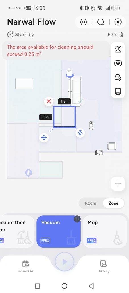 Flow 在我家公寓里导航得非常完美。第一次测试运行,几分钟内就绘制出了我家大部分区域的地图。它支持保存多个楼层或地图,并且可以在应用程序中存储多达四个独立的文件夹,方便您在不同楼层之间移动它。机器人行驶过程中会不断更新地图并检测新的障碍物。我可以在应用程序中设置虚拟禁区和隐形墙,引导它避开不希望它进入的区域(例如宠物食盆所在的区域)。这些功能现在已成为高端扫地机器人的标配。我还很喜欢可以手动将家具添加到虚拟地图上。所以我告诉了它猫砂盆、猫抓板、食盆等等的位置。